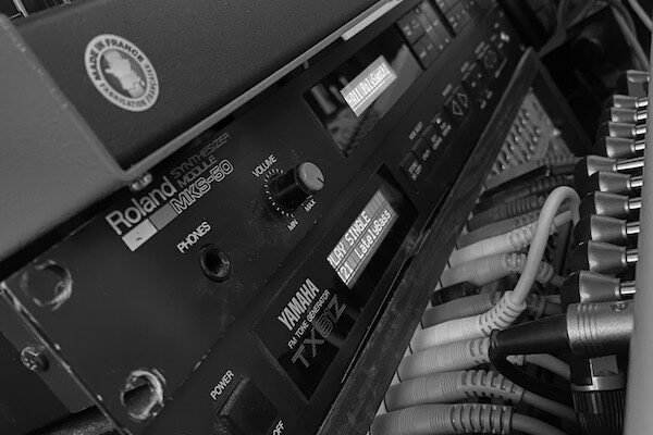 We’ve had many different configurations over the years and have now settled on a patch bay system that means that every single machine is ready to record without a single patch cable